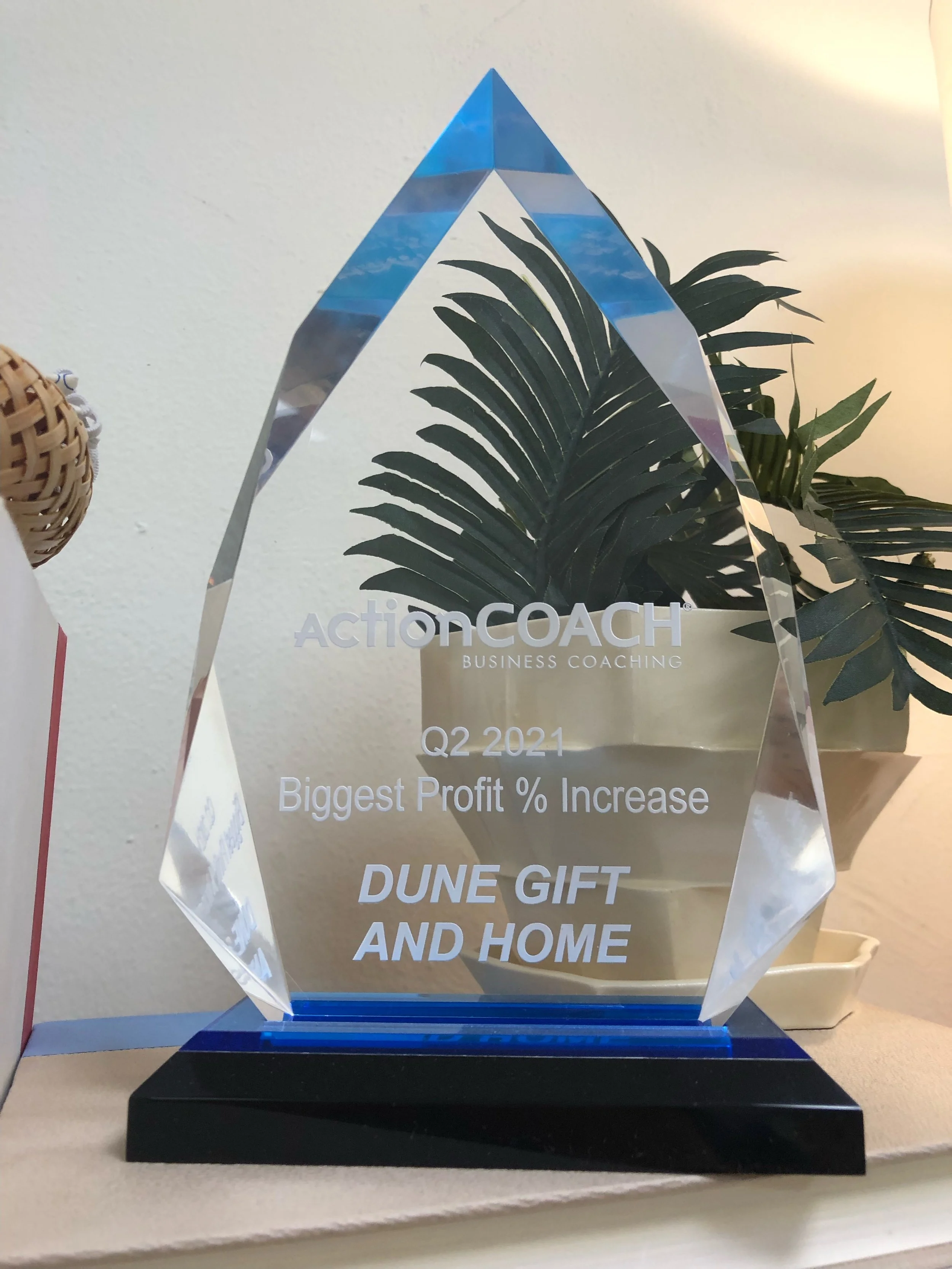As the Store Director of Dune Gift and Home, I work with ActionCOACH Business Coaching in order to maintain results-driven business. ActionCOACH works with over 100+ businesses throughout Wisconsin. For Q2 2021, my team received an award for Biggest Profit % Increase within the Dane County region.